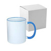"Czysty" kubek z niebieskim uszkiem do wykonywania nadruków w technologii sublimacji z kartonikiem
