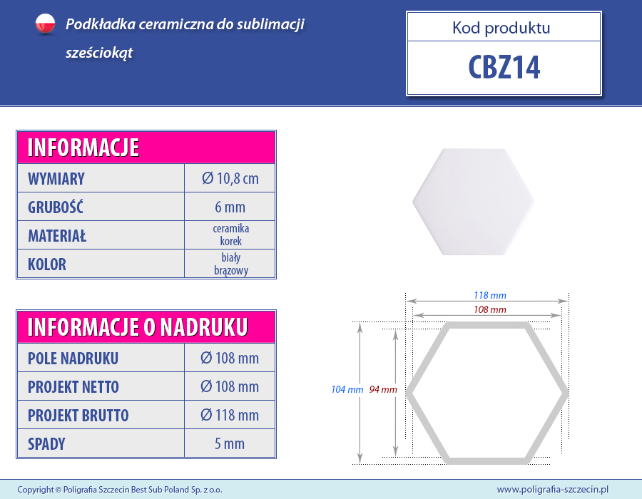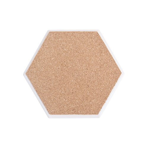 Sześciokątna, ceramiczna podkładka pod kubek do wykonywania nadruków w technologii sublimacji. W komplecie samoprzylepny korkowy spód zapobiegający przesuwaniu. Doskonały dodatek do kubków z nadrukiem.