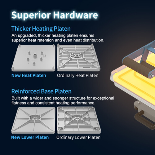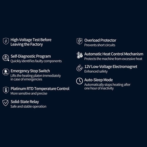 Wszystkie oferowane przez nas prasy posiadają 12 miesięczną gwarancję na elementy mechaniczne oraz elektroniczne. Gwarancji nie podlegają elementy grzejne. Posiadamy wszystkie podzespoły oraz części zamienne do pras znajdujących się aktualnie w ofercie oraz starszych modeli pras wycofanych z oferty.