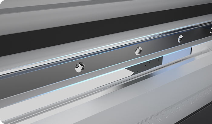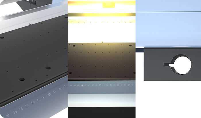 Powierzchnia i platforma drukująca z powłoką odporną na korozję zapewniają większą trwałość; zintegrowane oświetlenie LED; rama podstawy posiada specjalnie zaprojektowane wycięcia umożliwiające łatwe przenoszenie maszyny.