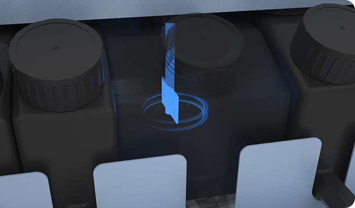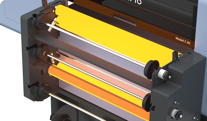 Nie ma potrzeby dodatkowego laminatora! Model C 60 łączy drukowanie i laminowanie w jednej maszynie, dzięki czemu proces jest płynny i wydajny. Drukuje na folii A, utwardza ją wbudowanymi światłami LED i automatycznie laminuje ją folią B, samodzielnie obsługując cały proces.