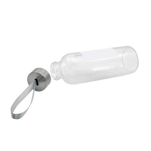 Butelka szklana o pojemności 420 ml z prostokątną ramką do wykonywania nadruków w technologii sublimacji. Butelka z metalową zakrętką z tasiemką.