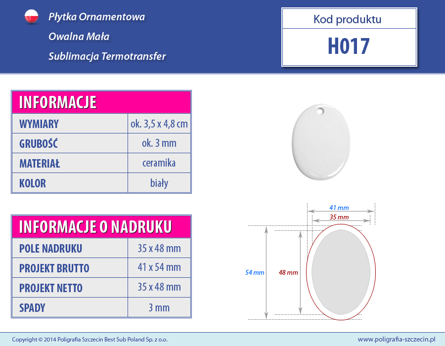 Płytka ceramiczna owalna mała z dziurką, klasy A+ do wykonywania nadruków w technologii sublimacji. Możliwość zakupu od jednej sztuki.