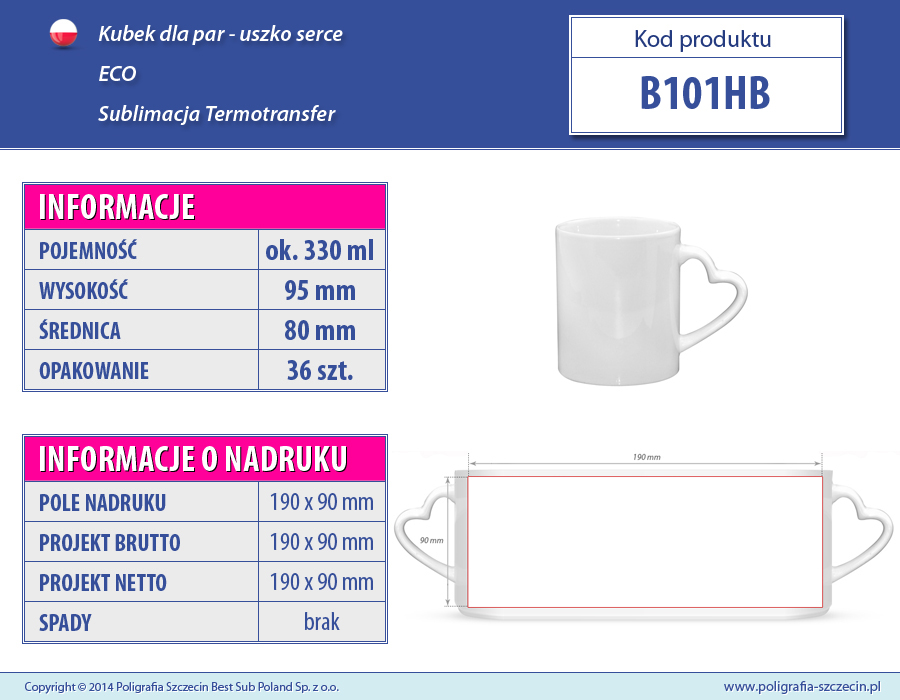 Kubek z uszkiem w kształcie serca, klasy ECO /sprawdź czym różni się ceramika tej klasy od pozostałych/ powlekany warstwą poliestru do wykonywania nadruków w technologii sublimacji. Możliwość zakupu od jednej sztuki.