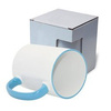 "Czysty" kubek z uszkiem i wnętrzem w kolorze błękitnym do wykonywania nadruków w technologii sublimacji z kartonikiem